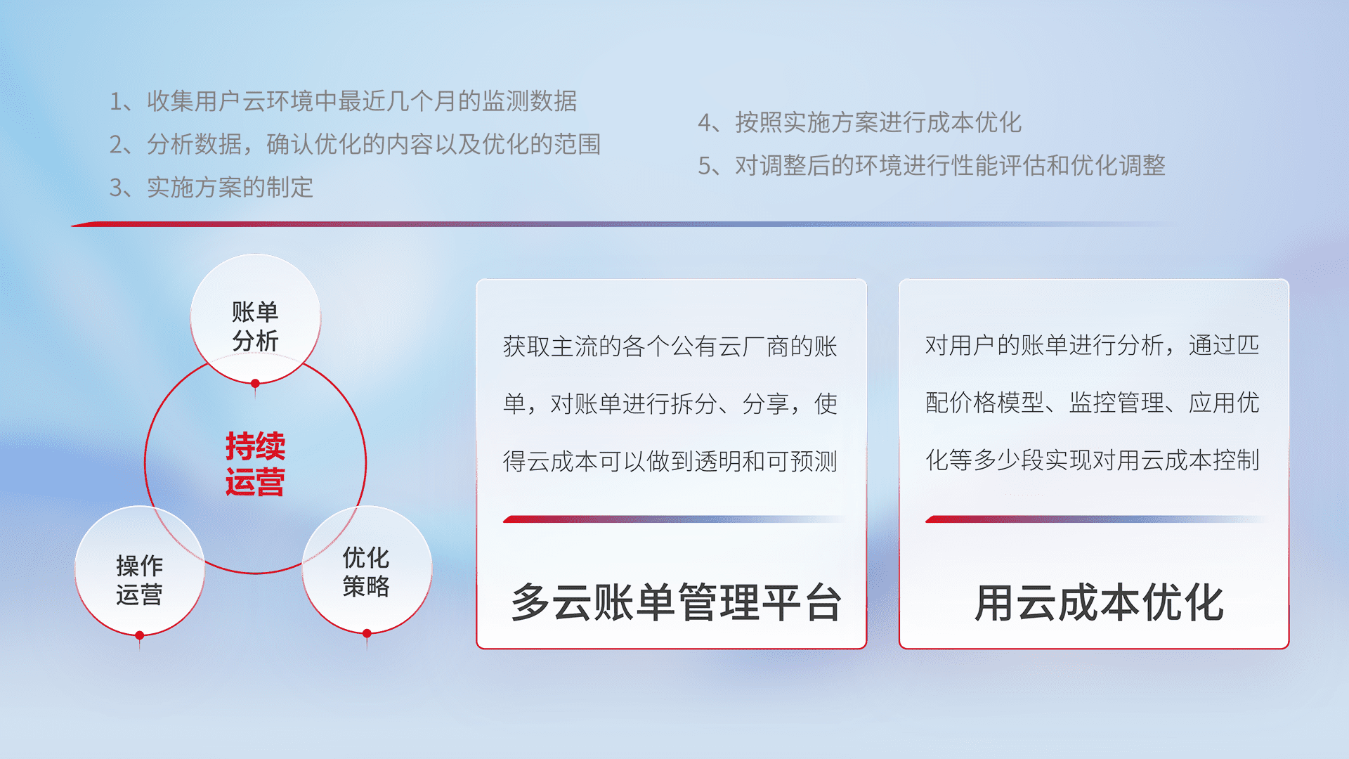 通过多云纳管,,,以统一的资源数据模型把客户的云资源进行抽象和封装,,,,进而实现对多云资源的统一操作,,,,保障云资源管理的可靠性、、、、稳定性与可用性。。。量身定制化运维内容,,,,配置、、、开发运维、、补丁管理、、备份、、监控、、、认证和访问管理、、、、审计和日常巡检等,,,,保障在用云过程中的可靠度,,,稳定度以及高可用率。。。。